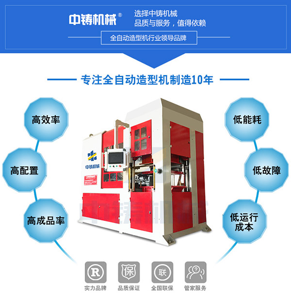 中鑄全自動造型機具有四高三低的特點:高配置、高效率、高成活率、高使用壽命、低故障、低能耗、低維護成本。
